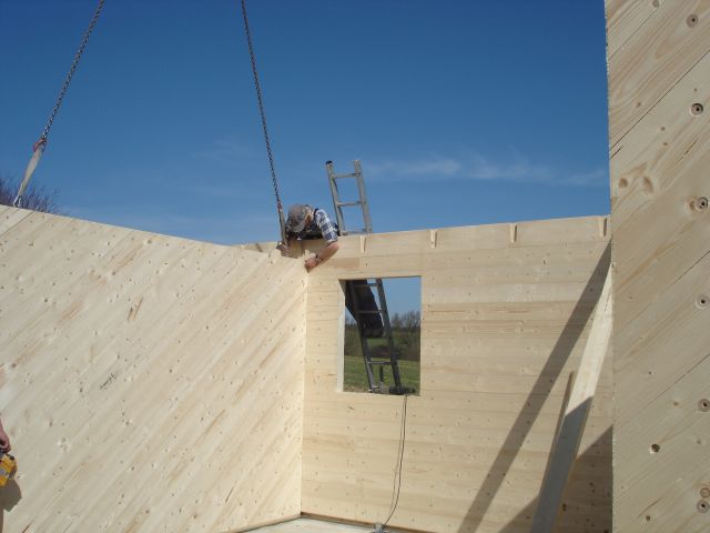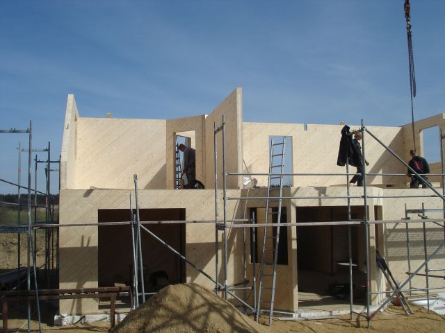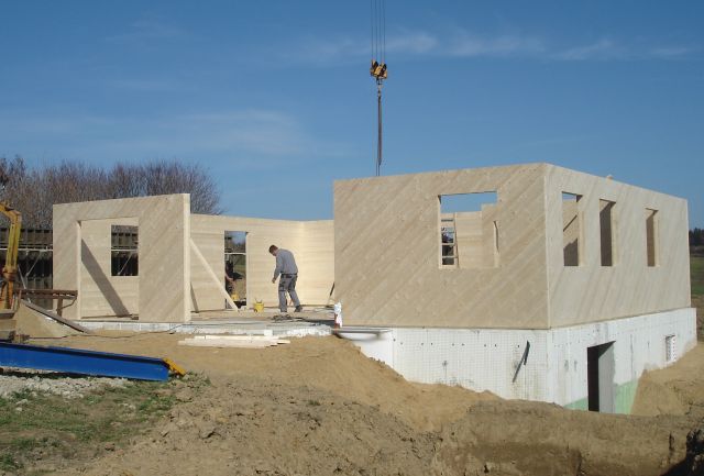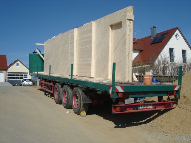 Die exakt vorgefertigten massiven Wände werden angeliefert.