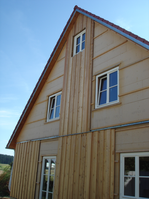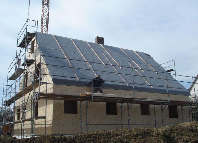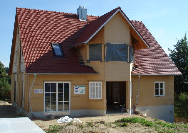 Anschließend wird das Haus außen mit Holzfasenplatten gedämmt...