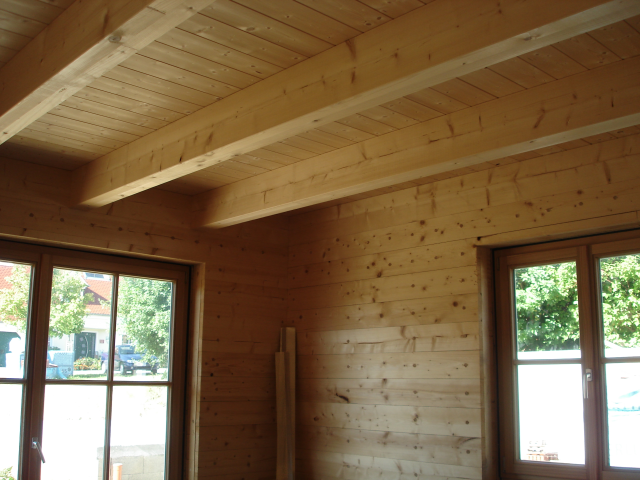 Sogar die Aussparungen für die Holzverbindungen der Balkendecke sind schon millimetergenau eingefräst.